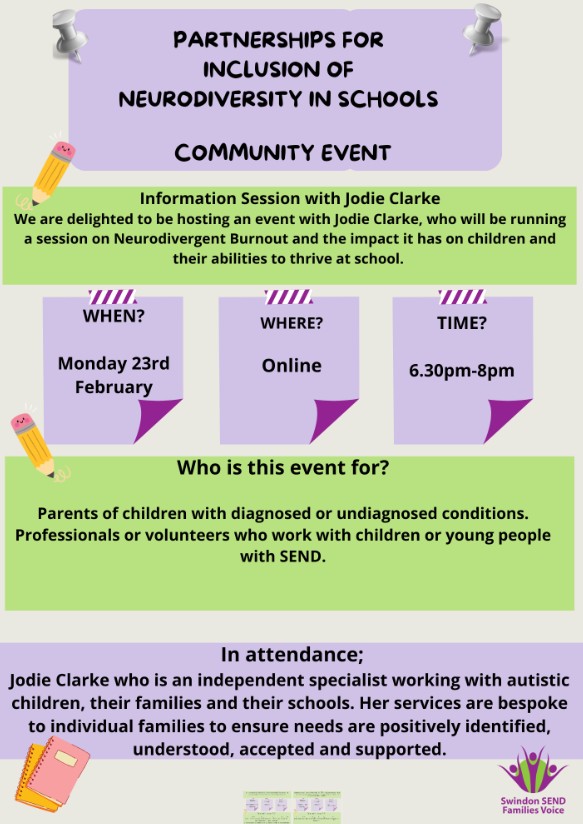 If you are interested in joining the online event, please email Swindon SEND Families Voice at swindonSENDfamiliesvoice@outlook.com for the meeting code. Provide your name, email and which event you would like to attend so that they can send you a code to access the meetings online.