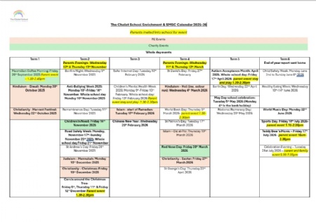 Welcome to the new 2025 - 2026 academic year at The Chalet School. We have lots of wonderful events, holidays, and festivities to celebrate. Attached please find our Enrichment and SMSC (Spiritual, Moral, Social, and Cultural) calendar. We have lots of Parent Events throughout the year. Please make a note in your calendars and joins us if you can. We look forward to seeing you soon.