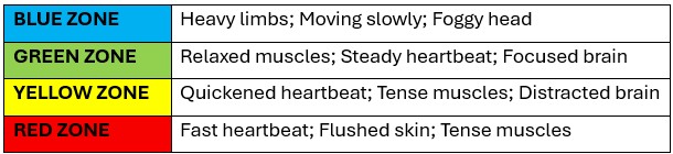 Individual with a diagnosis of Autism may experience alexithymia, which is the disconnect in identifying between an emotion and the physical feeling and can cause confusion in discerning what emotion is being felt. This is particularly true in respect of the red zone and distinguishing between the feelings of anger, fear and elation. It is, therefore, helpful to support individuals to recognise the different possible body signals common with the zones: